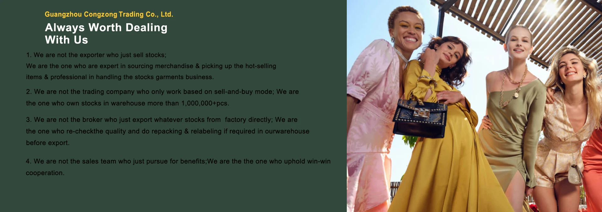 Congzong Established in 2015, We are committed to providing our customers with unimaginable bargains and attractive apparel merchandise, which specializes in providing garments stocks with CHEAP PRICE, A QUALITY, FAST SHIPPING for over 10yrs.